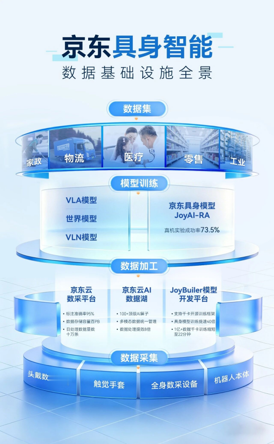 近日,京东具身智能生态发布会上,京东宣布在全球首推覆盖“采、存、标、训、评、仿、测”全链路的具身智能数据基础设施,自研超高清采集终端JoyEgoCam、具身大模型JoyAI-RA、具身智能数据交易平台等均亮相。